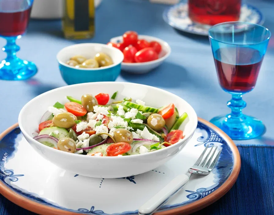 De Griekse salade, ook wel bekend als "dorpssalade", is een veelzijdig gerecht dat kan worden geserveerd als voorgerecht, bijgerecht of zelfs hoofdgerecht. Traditioneel wordt deze salade gepresenteerd in een diep bord of een kom.
